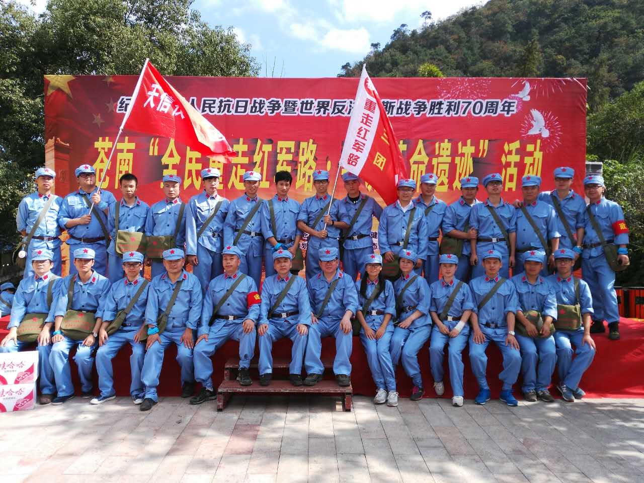 一路上,天信隊(duì)員發(fā)揮了發(fā)揚(yáng)了紅軍不怕艱苦、團(tuán)結(jié)奮進(jìn)、克服困難的革命精神。盡管山路崎嶇,兩邊雜草叢生,但隊(duì)員們依舊排著整齊的隊(duì)伍,勇往直前,激情高歌,每當(dāng)有隊(duì)員感到體力不支放慢速度時(shí),其它隊(duì)員不由而約地為其加油鼓勁,并在政委的指揮下喊出整齊響亮的隊(duì)號(hào)天信天信,奮勇前進(jìn),伴隨著一聲聲鏗鏘有力的吶喊聲音,隊(duì)員們又重新充滿了力量!在龍井休息站,隊(duì)員們分享到了當(dāng)?shù)乩习傩辗职l(fā)的紅糖包和紅雞蛋。因?yàn)楸敬翁煨攀亲鳛橐粋€(gè)團(tuán)隊(duì)參加這種大型活動(dòng),所以每位天信隊(duì)員都特別注意自身言行,自覺地把產(chǎn)生的垃圾裝袋后帶走,用實(shí)際行動(dòng)踐行著天信人愛護(hù)環(huán)境的承諾。